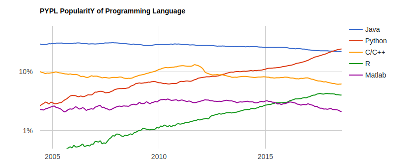 The PYPL Index is created by analyzing how often language tutorials are searched on Google (generated using raw data from Google Trends).